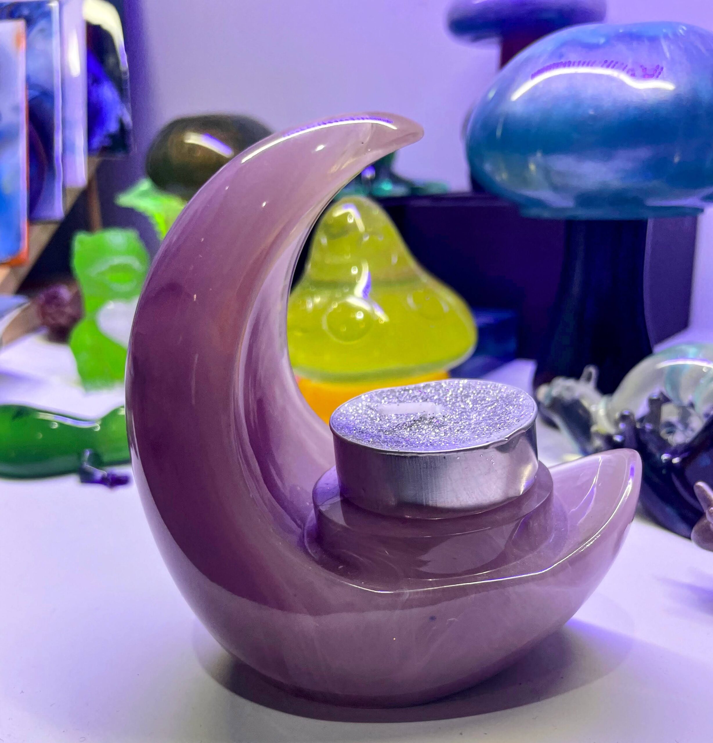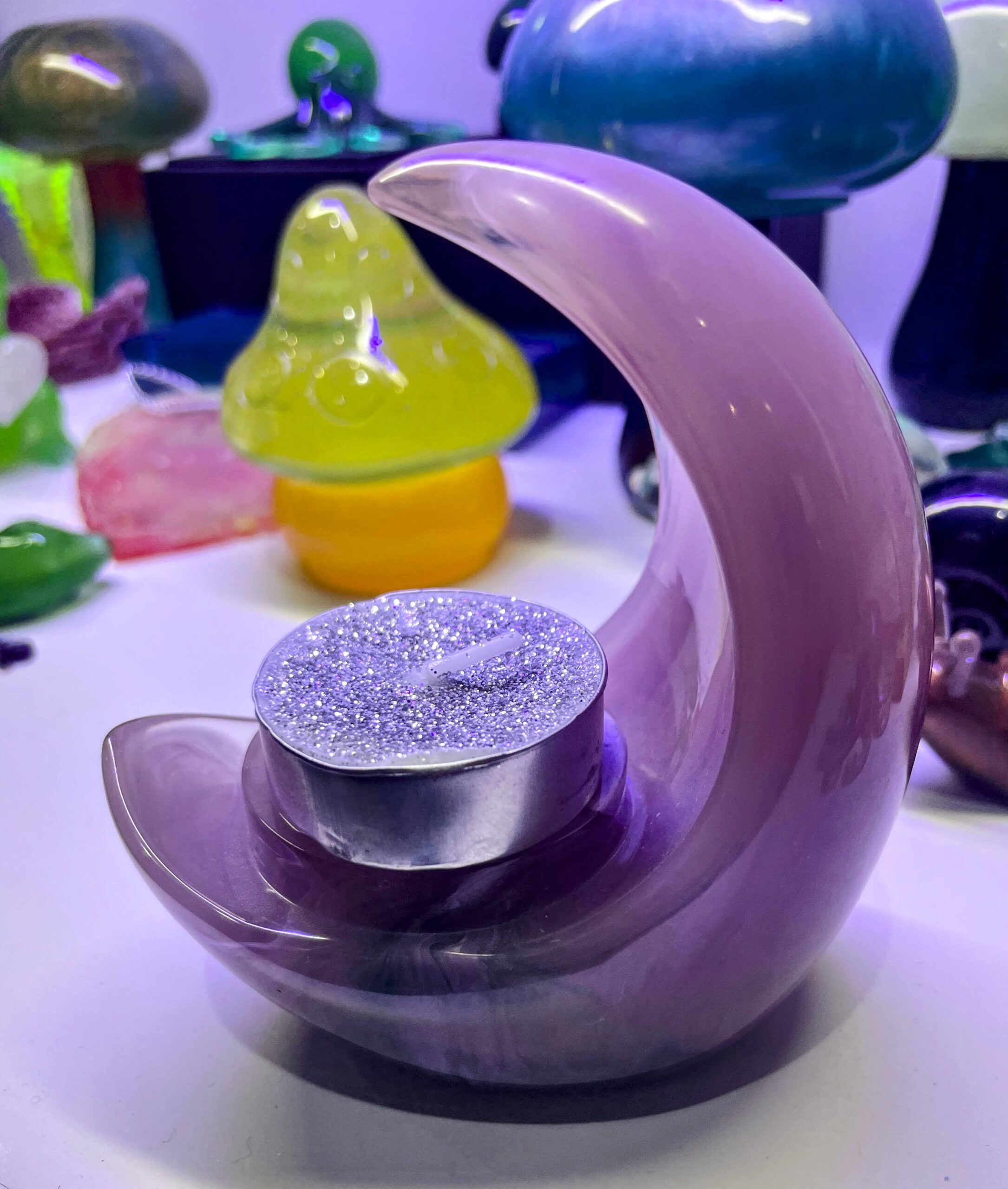 Elevate your space with this stunning candle holder, meticulously handcrafted from premium resin. Standing at 4 inches tall, its exquisite crescent moon design adds a touch of magic and charm to any setting. Other colour options are available.